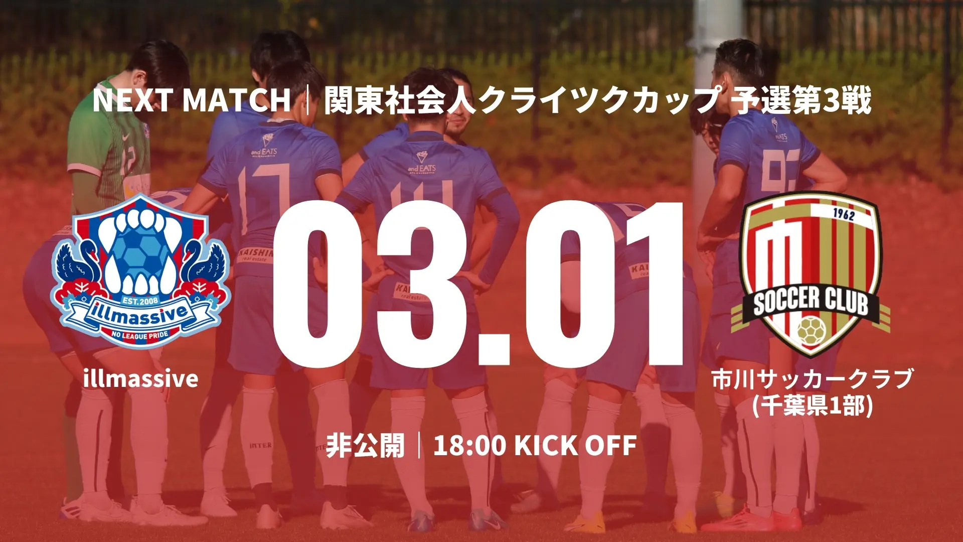 PURPOSESTAY AND PLAYサッカーをやめる人を減らす新しい選択肢になるNO LEAGUE PRIDEリーグ無所属社会人サッカーチームの価値向上 CLUB INTRODUCTION ABOUT US 2026年1月29日 【新メンバー】三堀亜門選手が加入 429 2026年1月19日 【新メンバー】伊藤啓佑選手が加入 405 2025年11月29日 【新メンバー】梅村脩斗選手が加入 504 2025年11月25日 【新メンバー】塩谷知哉選手が加入 440 2025年10月25日 【新メンバー】三ッ田啓希選手が加入 808 2025年10月23日 【新メンバー】前田海選手が加入 547 ALL NEWS 誰にも真似できない「リーグ無所属」という生き方で日本の社会人サッカー史に名を残す唯一無二の社会人サッカークラブになる。 ABOUT US MATCH SCHEDULE 2.22 [SUN] 18:00K.O|クライツクカップ2026 予選第2戦 vs CERVEZA FC東京(東京都1部)|非公開 3.1 [SUN] 18:00K.O|クライツクカップ2026 予選第3戦 vs 市川SC(千葉県1部)|非公開 3.8 [SUN] 10:00K.O|横浜カップ 決勝 vs JFC FUTURO(神奈川県2部)|ニッパツ三ツ沢球技場 CALENDAR Instagram . // 𝙒𝙚𝙡𝙘𝙤𝙢𝙚 . // 𝙒𝙚𝙡𝙘𝙤𝙢𝙚 𝙉𝙚 . ➪イベント|都内で、2025年、蹴り納めしませんか? 昨年も開催した社会 . // 𝙒𝙚𝙡𝙘𝙤𝙢𝙚 𝙉𝙚𝙬 . // 𝙒𝙚𝙡𝙘𝙤𝙢𝙚 𝙉𝙚𝙬 . // 𝙒𝙚𝙡𝙘𝙤𝙢𝙚 𝙉𝙚𝙬 𝙏𝙚 . // 𝙒𝙚𝙡𝙘𝙤𝙢𝙚 𝙉𝙚𝙬 𝙏𝙚𝙖𝙢 . ➪9月・10月の活動スケジュール Instagramの投稿がな illmassiveをフォローする